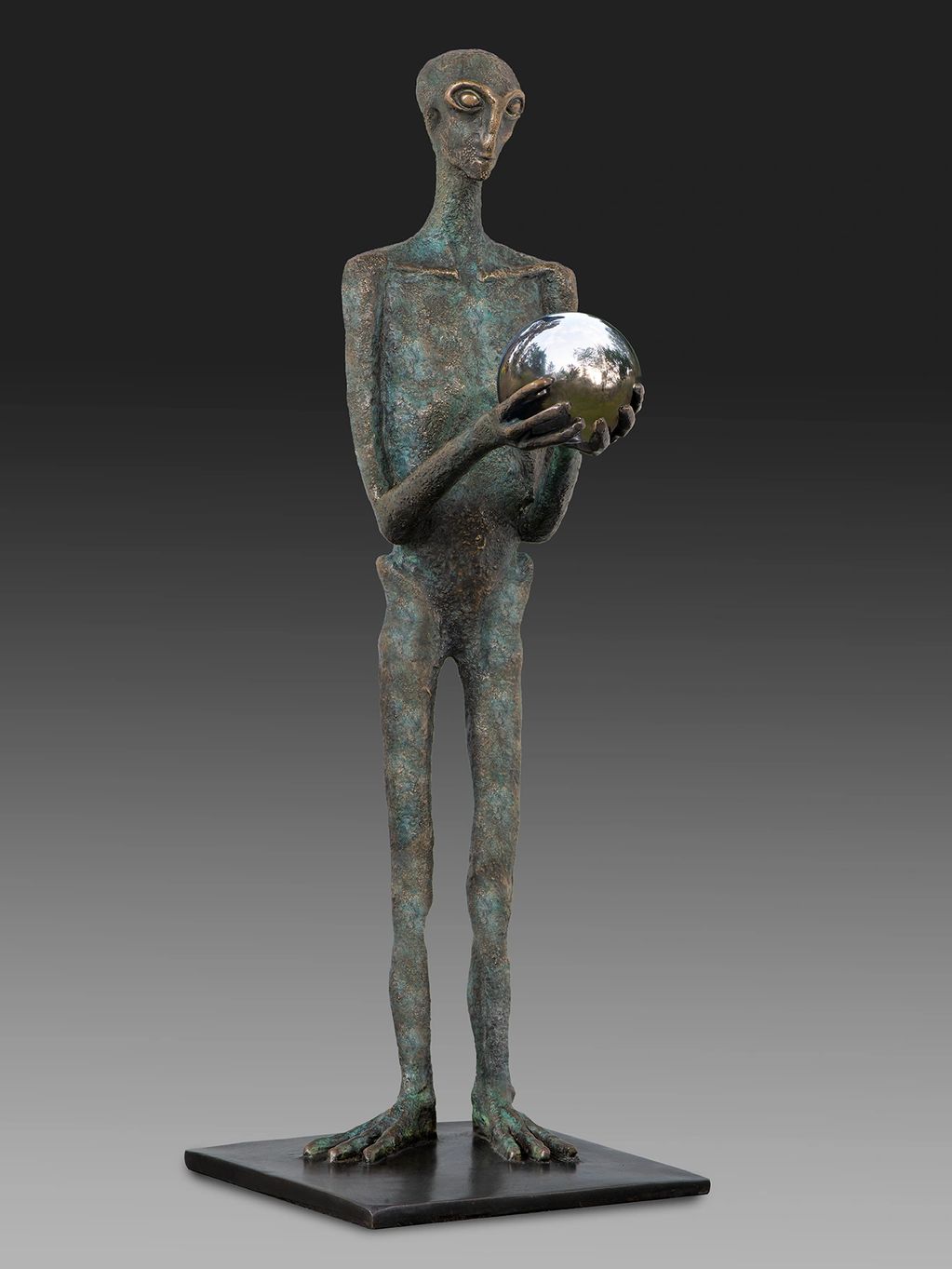 What beautiful, tall beings, gentle and loving. Working on this piece was a challenge and an exercise in trust. When you gaze into their highly polished globe you will see your reflection as a reminder that your New World will be of your own creation. The key is being willing to be fluid and flexible and to accept change in a rapidly changing world.