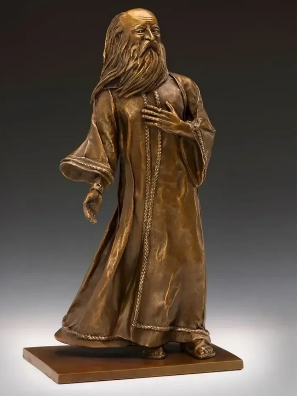 I wanted to sculpt an Alchemist. I would feel his hushed presence in the background, but he remained elusive. One day, he whispered to me slowly and gently in the silence to go into the studio. He is a quiet, tender soul with a profound, intense spiritual commitment. Within him, he holds a powerful, sacred light for healing the polarity in others.